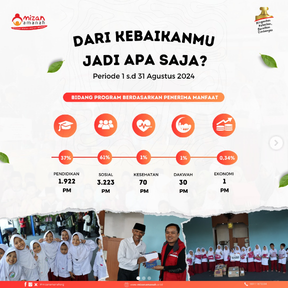 Penyaluran berbagai program-program dan aksi kebaikan para relawan Mizan Amanah tanggal 1 – 31 Agustus 2024 berhasil dilaksanakan dan tersalurkan kepada mereka yang membutuhkan.